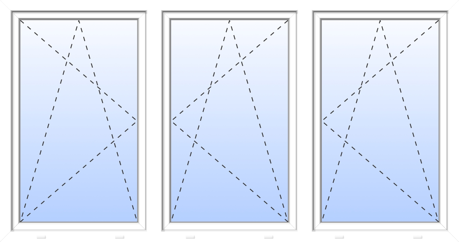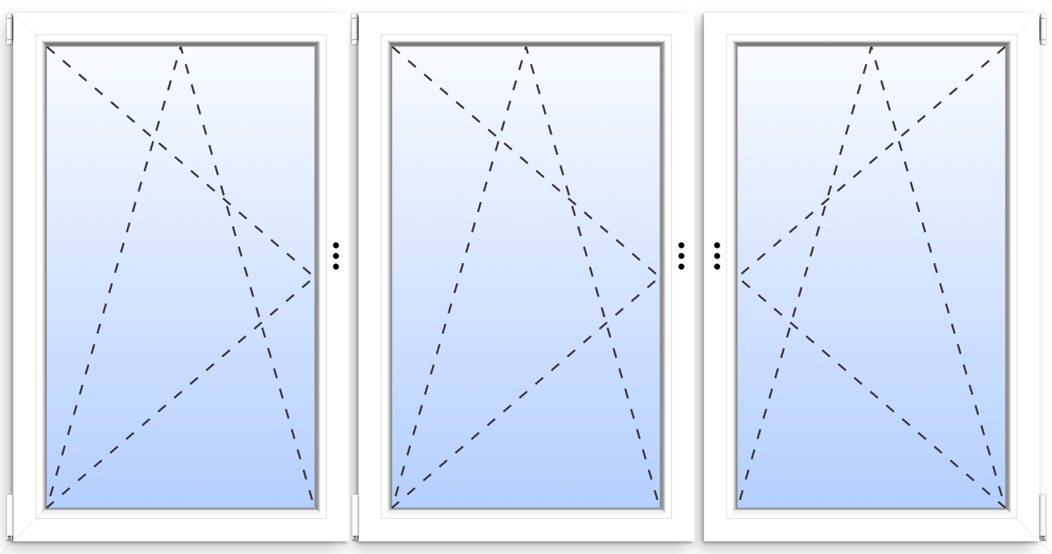 ✓ symmetrisches Fenster mit festen Pfosten ✓ 3-fach Verglasung ✓ Teilung 1/3 zu 1/3 zu 1/3 ✓ Öffnung aller Flügel möglich ✓ Dreh-Kipp